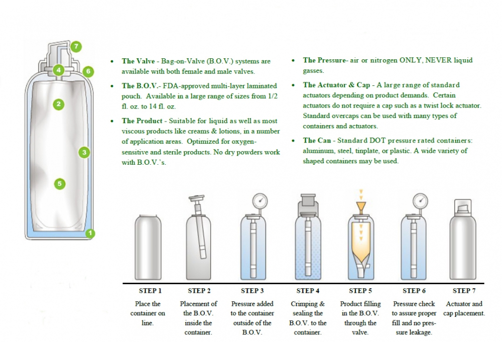 BOV مخفف Bag On Valve به معنای والو در پاکت است. تولید اسپری به روش BOV یکی از انواع روش های تولید اسپری است و به ویژه در تولید اسپری های مواد غذایی و مواد آرایشی و بهداشتی کاربرد دارد. در این روش ماده اصلی اسپری داخل پاکت تزریق شده سپس گاز پیشرانه پشت پاکت و در فضای بین دیوار داخلی قوطی اسپری و لایه بیرونی پاکت قرار میگیرد و هیچ گونه تماسی بین مایع و گاز پیشرانه وجود ندارد.